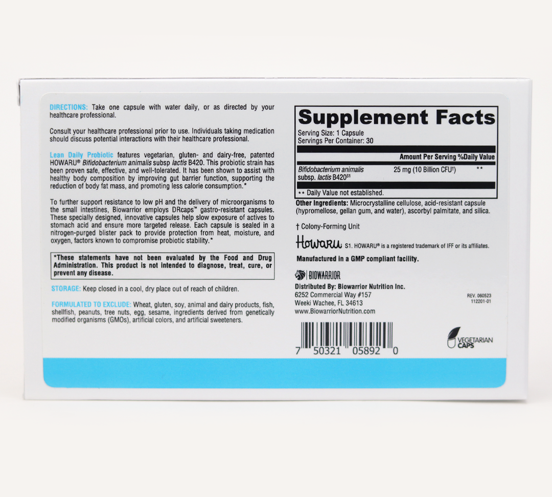 Lean Daily Probiotic features the clinically studied HOWARU®B420—a vegetarian, gluten and dairy-free probiotic shown to support healthy body composition. †